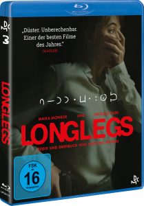 Longlegs: USA 2024; Regie: Osgood Perkins; Darsteller: Maika Monroe, Nicolas Cage, Blair Underwood, Michelle Choi-Lee; FSK: ab 16 Jahren; Dauer: 102 Minuten; Sprachen: Deutsch DTS-HD MA 5.1, Englisch DTS-HD MA 5.1; Untertitel: Deutsch, Englisch; Bild: 1,85:1 (16:9 anamorph Widescreen); Vertrieb: ©DCM / LEONINE Studios. Veröffentlichung Verkauf: 15. November 2024.